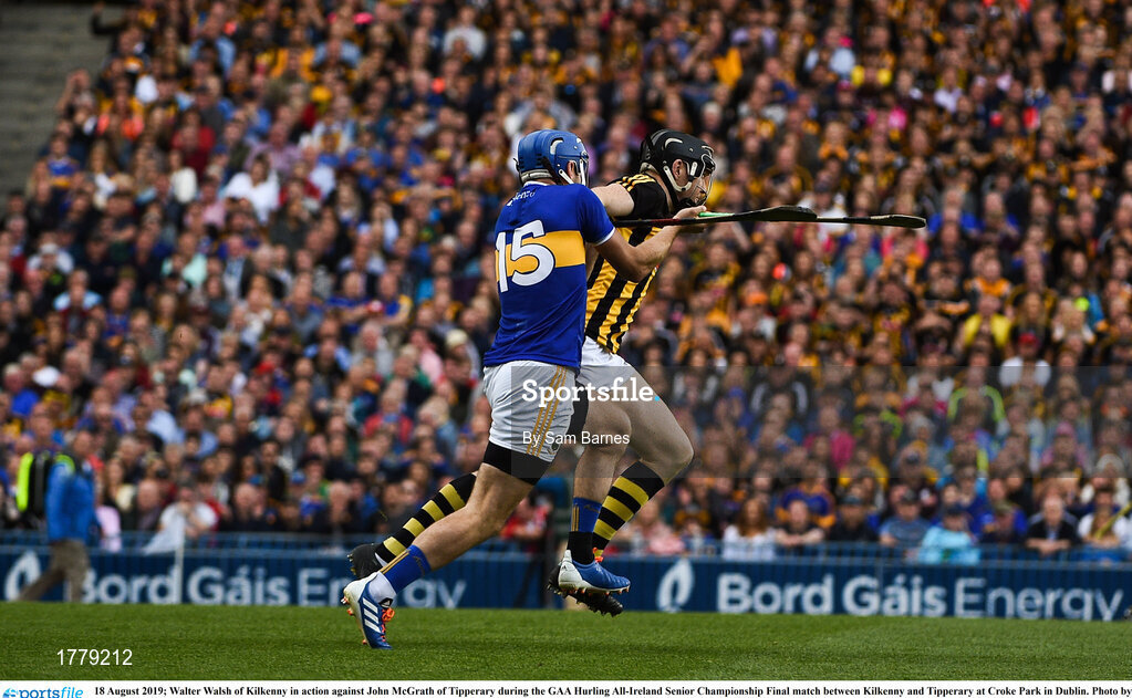 18 August 2019; Walter Walsh of Kilkenny in action against John McGrath of Tipperary during the GAA Hurling All-Ireland Senior Championship Final match between Kilkenny and Tipperary at Croke Park in Dublin. Photo by Sam Barnes/Sportsfile