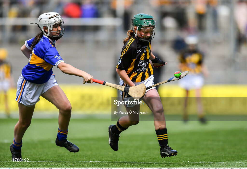 18 August 2019; Anna Doheny, Scoil Ruadhain, Tullaroan, Kilkenny, representing Kilkenny, in action against Megan O'Grady, Knockavilla NS, Knockavilla, Tipperary, representing Tipperary, during the INTO Cumann na mBunscol GAA Respect Exhibition Go Games prior to the GAA Hurling All-Ireland Senior Championship Final match between Kilkenny and Tipperary at Croke Park in Dublin. Photo by Piaras Ó Mídheach/Sportsfile