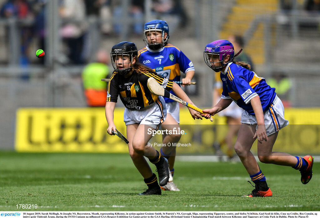 18 August 2019; Sarah McHugh, St Josephs NS, Boyerstown, Meath, representing Kilkenny, in action against Grainne Smith, St Patrick’s NS, Geevagh, Sligo, representing Tipperary, centre, and Síofra Ní hOisín, Gael Scoil de hÍde, Cnoc na Crúibe, Ros Comáin, ag imirt i gcóir Tiobraid Árann, during the INTO Cumann na mBunscol GAA Respect Exhibition Go Games prior to the GAA Hurling All-Ireland Senior Championship Final match between Kilkenny and Tipperary at Croke Park in Dublin. Photo by Piaras Ó Mídheach/Sportsfile