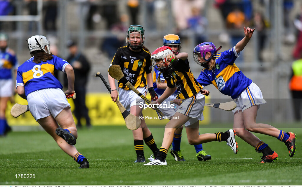 18 August 2019; Sarah Sheehan, Drumphea NS, Garryhill, Muine Bheag, Carlow, representing Kilkenny, in action against Síofra Ní hOisín, Gael Scoil de hÍde, Cnoc na Crúibe, Ros Comáin, ag imirt i gcóir Tiobraid Árann, right, during the INTO Cumann na mBunscol GAA Respect Exhibition Go Games prior to the GAA Hurling All-Ireland Senior Championship Final match between Kilkenny and Tipperary at Croke Park in Dublin. Photo by Piaras Ó Mídheach/Sportsfile