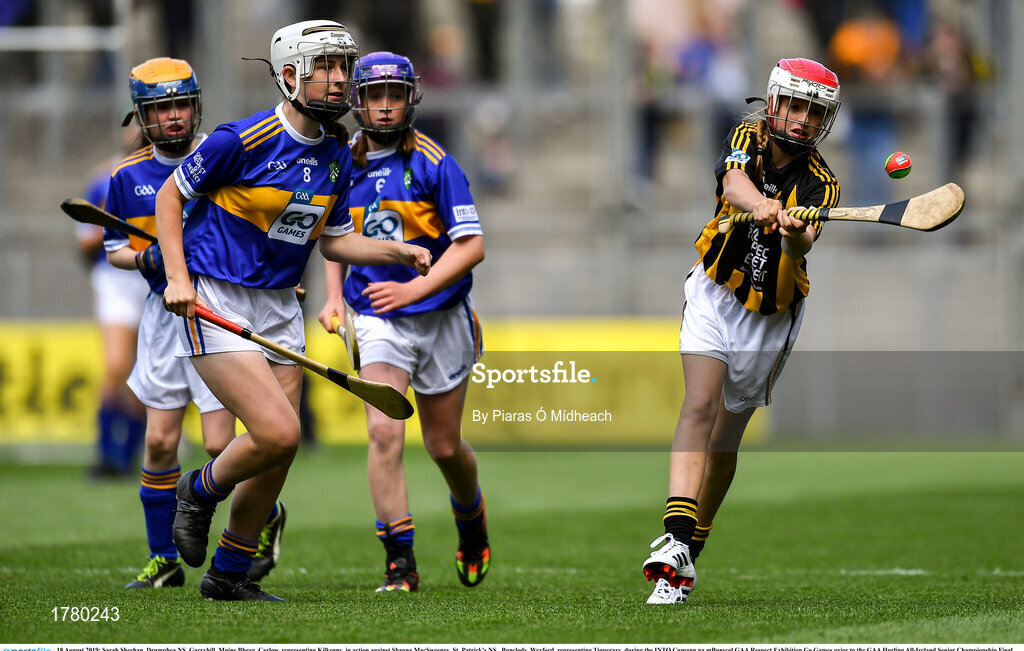 18 August 2019; Sarah Sheehan, Drumphea NS, Garryhill, Muine Bheag, Carlow, representing Kilkenny, in action against Shauna MacSweeney, St. Patrick’s NS , Bunclody, Wexford, representing Tipperary, during the INTO Cumann na mBunscol GAA Respect Exhibition Go Games prior to the GAA Hurling All-Ireland Senior Championship Final match between Kilkenny and Tipperary at Croke Park in Dublin. Photo by Piaras Ó Mídheach/Sportsfile
