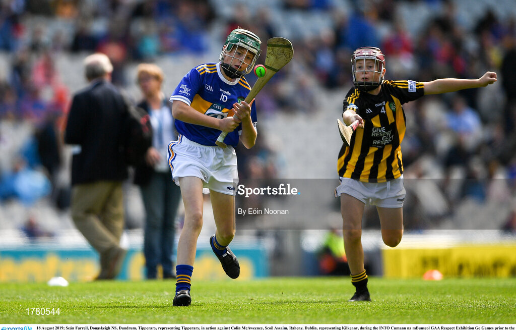 18 August 2019; Seán Farrell, Donaskeigh NS, Dundrum, Tipperary, representing Tipperary, in action against Colin McAweeney, Scoil Assaim, Raheny, Dublin, representing Kilkenny, during the INTO Cumann na mBunscol GAA Respect Exhibition Go Games prior to the GAA Hurling All-Ireland Senior Championship Final match between Kilkenny and Tipperary at Croke Park in Dublin. Photo by Eóin Noonan/Sportsfile