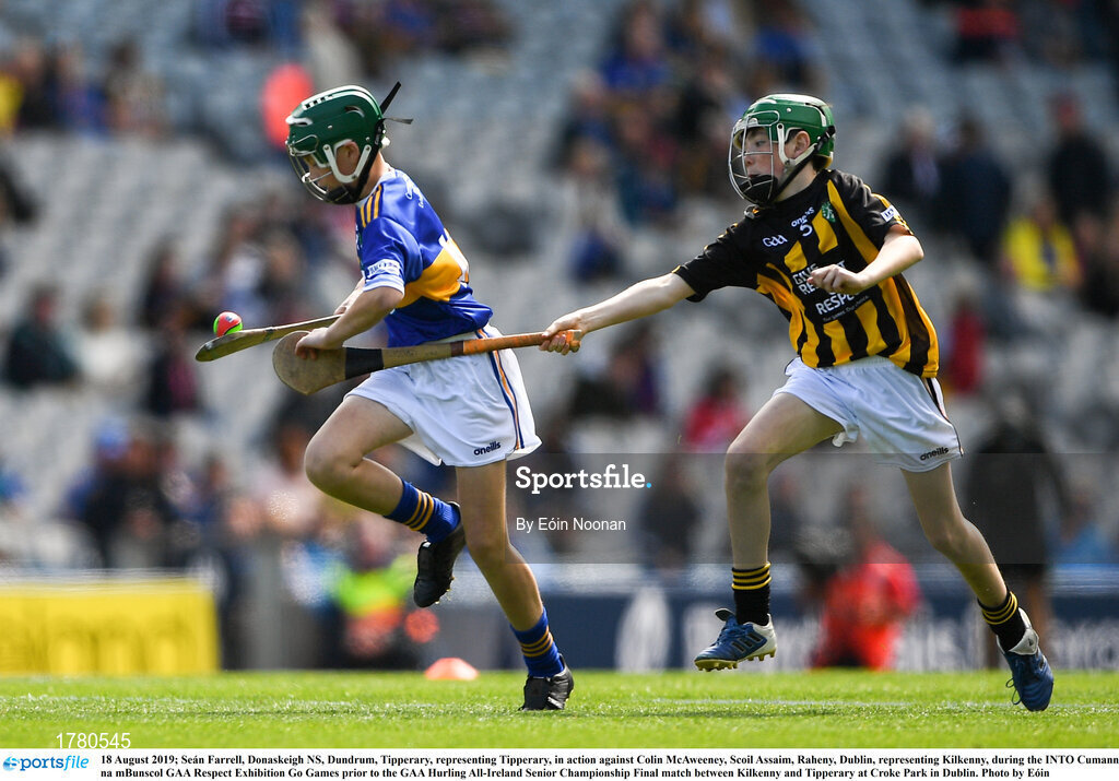 18 August 2019; Seán Farrell, Donaskeigh NS, Dundrum, Tipperary, representing Tipperary, in action against Colin McAweeney, Scoil Assaim, Raheny, Dublin, representing Kilkenny, during the INTO Cumann na mBunscol GAA Respect Exhibition Go Games prior to the GAA Hurling All-Ireland Senior Championship Final match between Kilkenny and Tipperary at Croke Park in Dublin. Photo by Eóin Noonan/Sportsfile