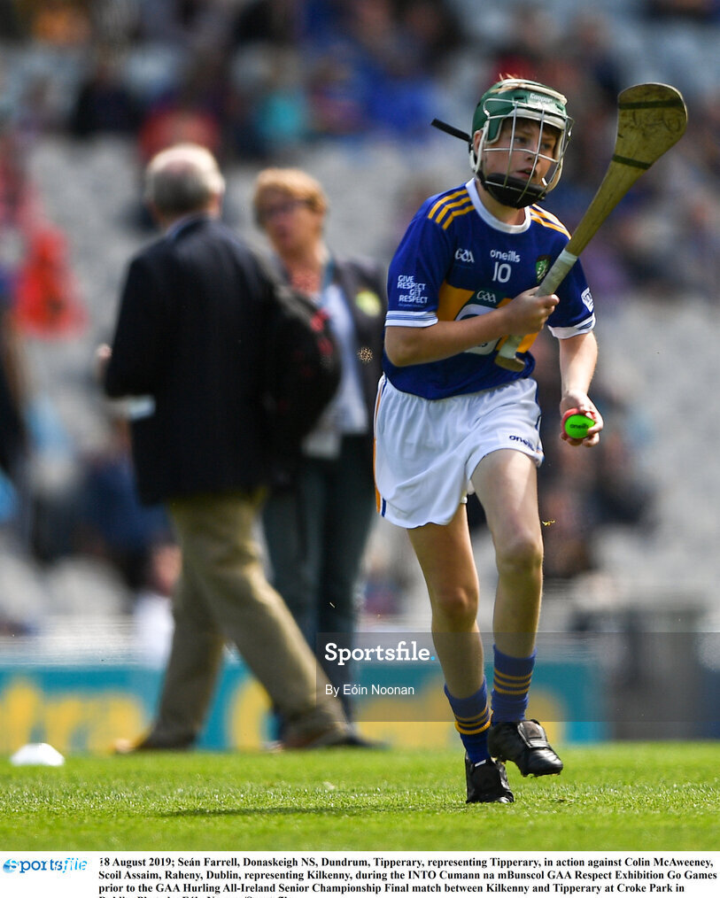 18 August 2019; Seán Farrell, Donaskeigh NS, Dundrum, Tipperary, representing Tipperary, during the INTO Cumann na mBunscol GAA Respect Exhibition Go Games prior to the GAA Hurling All-Ireland Senior Championship Final match between Kilkenny and Tipperary at Croke Park in Dublin. Photo by Eóin Noonan/Sportsfile