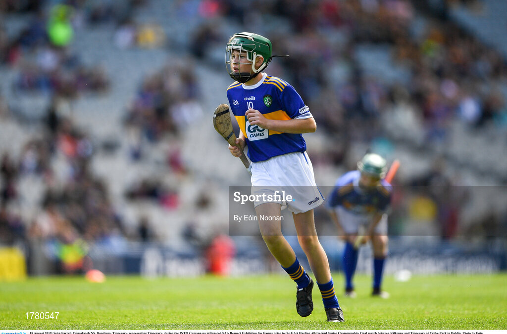 18 August 2019; Seán Farrell, Donaskeigh NS, Dundrum, Tipperary, representing Tipperary, during the INTO Cumann na mBunscol GAA Respect Exhibition Go Games prior to the GAA Hurling All-Ireland Senior Championship Final match between Kilkenny and Tipperary at Croke Park in Dublin. Photo by Eóin Noonan/Sportsfile