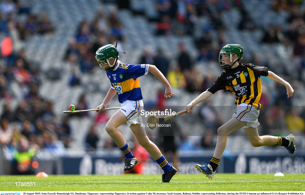 18 August 2019; Seán Farrell, Donaskeigh NS, Dundrum, Tipperary, representing Tipperary, in action against Colin McAweeney, Scoil Assaim, Raheny, Dublin, representing Kilkenny, during the INTO Cumann na mBunscol GAA Respect Exhibition Go Games prior to the GAA Hurling All-Ireland Senior Championship Final match between Kilkenny and Tipperary at Croke Park in Dublin. Photo by Eóin Noonan/Sportsfile