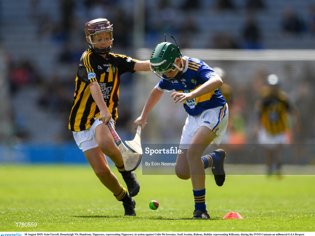 18 August 2019; Seán Farrell, Donaskeigh NS, Dundrum, Tipperary, representing Tipperary, in action against Colin McAweeney, Scoil Assaim, Raheny, Dublin, representing Kilkenny, during the INTO Cumann na mBunscol GAA Respect Exhibition Go Games prior to the GAA Hurling All-Ireland Senior Championship Final match between Kilkenny and Tipperary at Croke Park in Dublin. Photo by Eóin Noonan/Sportsfile