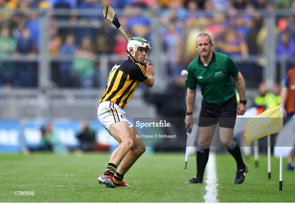 18 August 2019; Paddy Deegan of Kilkenny clears his lines as linesman Johnny Murphy looks on during the GAA Hurling All-Ireland Senior Championship Final match between Kilkenny and Tipperary at Croke Park in Dublin. Photo by Piaras Ó Mídheach/Sportsfile