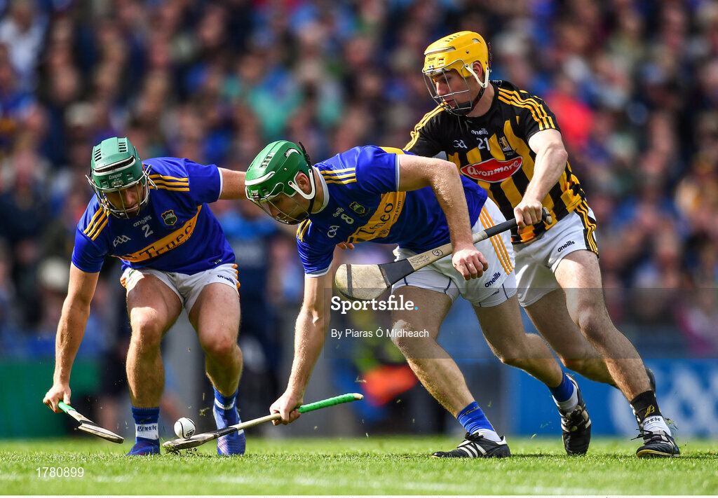 18 August 2019; Noel McGrath of Tipperary, centre, supported by team-mate Cathal Barrett, left, in action against Richie Leahy of Kilkenny during the GAA Hurling All-Ireland Senior Championship Final match between Kilkenny and Tipperary at Croke Park in Dublin. Photo by Piaras Ó Mídheach/Sportsfile