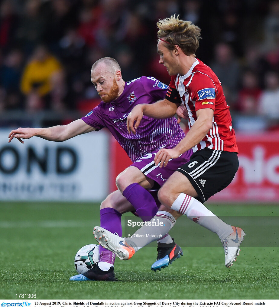 23 August 2019; Chris Shields of Dundalk in action against Greg Sloggett of Derry City during the Extra.ie FAI Cup Second Round match between Derry City and Dundalk at Ryan McBride Brandywell Stadium in Derry. Photo by Oliver McVeigh/Sportsfile