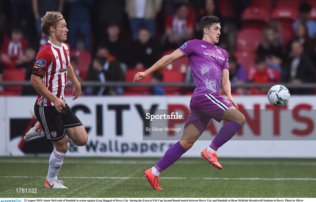 23 August 2019; Jamie McGrath of Dundalk in action against Greg Sloggett of Derry City during the Extra.ie FAI Cup Second Round match between Derry City and Dundalk at Ryan McBride Brandywell Stadium in Derry. Photo by Oliver McVeigh/Sportsfile
