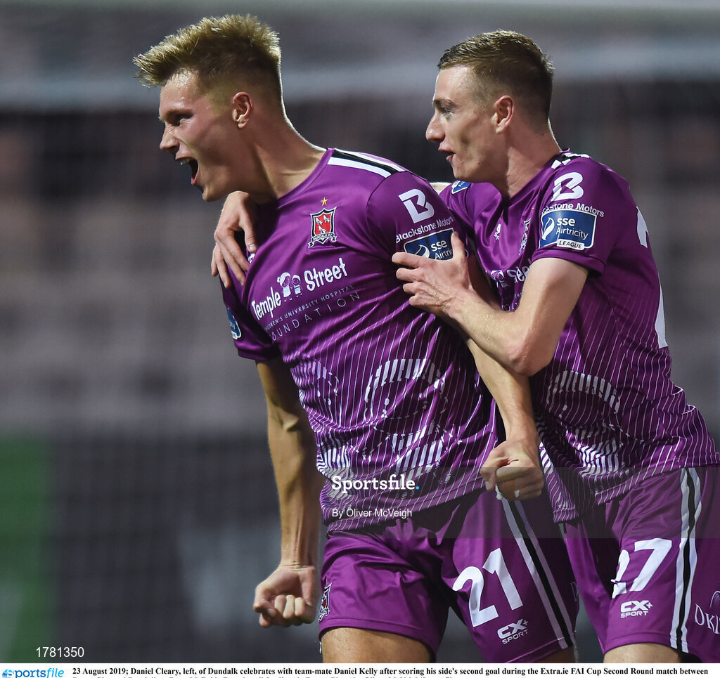 23 August 2019; Daniel Cleary, left, of Dundalk celebrates with team-mate Daniel Kelly after scoring his side's second goal during the Extra.ie FAI Cup Second Round match between Derry City and Dundalk at Ryan McBride Brandywell Stadium in Derry. Photo by Oliver McVeigh/Sportsfile