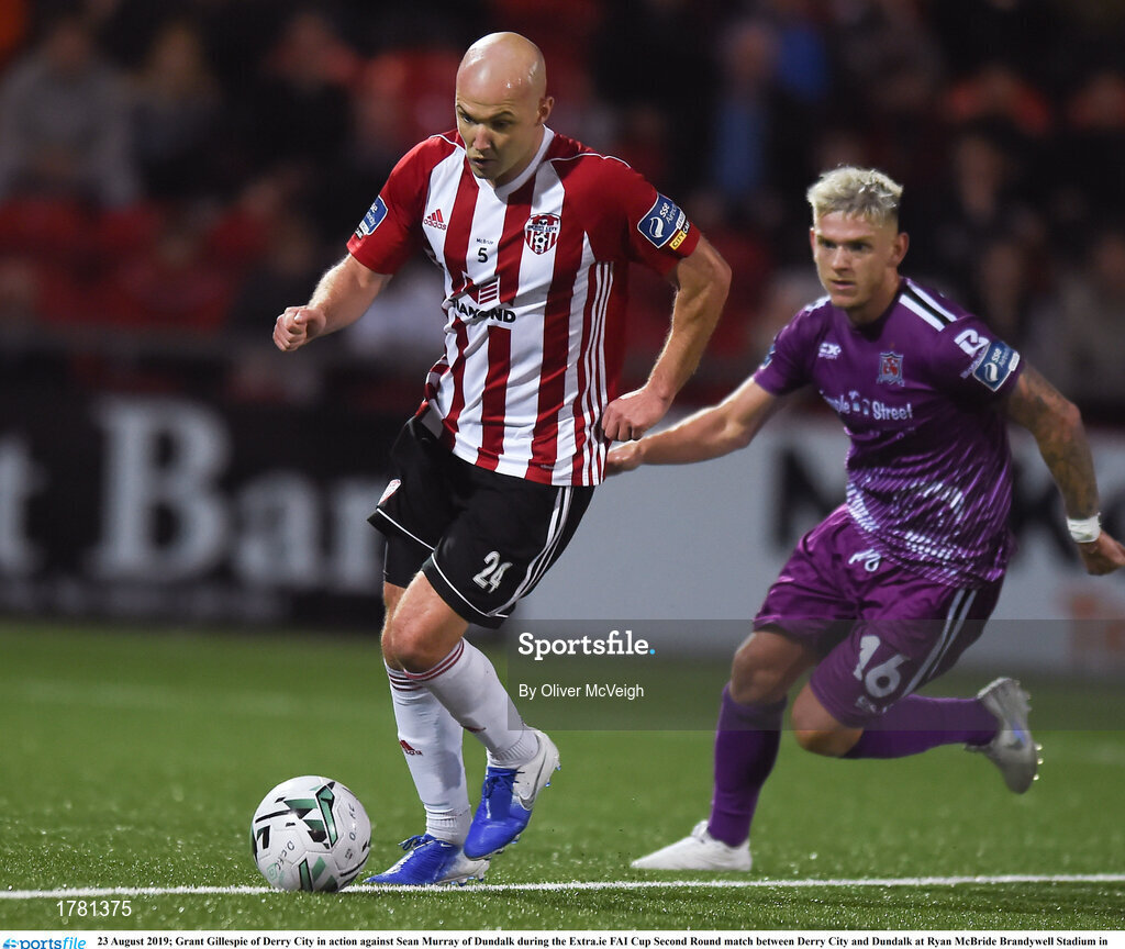 23 August 2019; Grant Gillespie of Derry City in action against Sean Murray of Dundalk during the Extra.ie FAI Cup Second Round match between Derry City and Dundalk at Ryan McBride Brandywell Stadium in Derry. Photo by Oliver McVeigh/Sportsfile