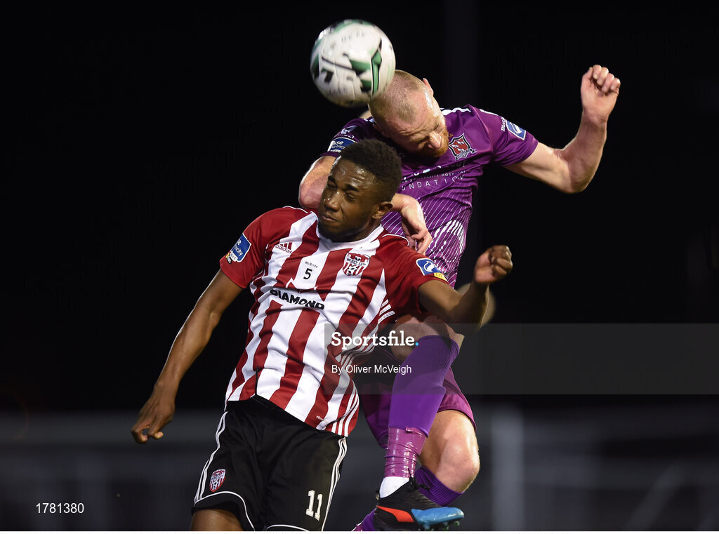 23 August 2019; Chris Shields of Dundalk in action against Junior Ogedi-Uzokwe of Derry City during the Extra.ie FAI Cup Second Round match between Derry City and Dundalk at Ryan McBride Brandywell Stadium in Derry. Photo by Oliver McVeigh/Sportsfile