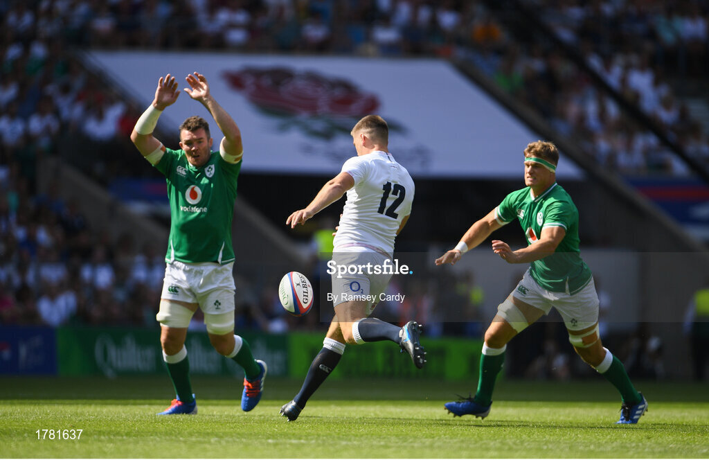24 August 2019; Owen Farrell of England is charged down by Peter O'Mahony of Ireland during the Quilter International match between England and Ireland at Twickenham Stadium in London, England. Photo by Ramsey Cardy/Sportsfile