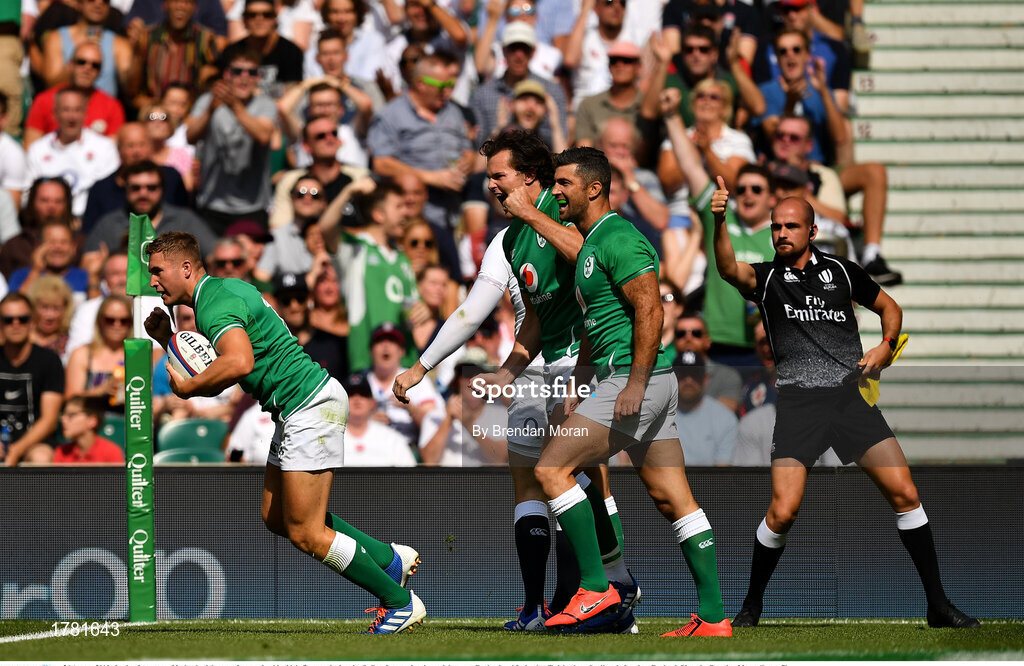 24 August 2019; Jordan Larmour of Ireland celebrates after scoring his side's first try during the Quilter International match between England and Ireland at Twickenham Stadium in London, England. Photo by Brendan Moran/Sportsfile