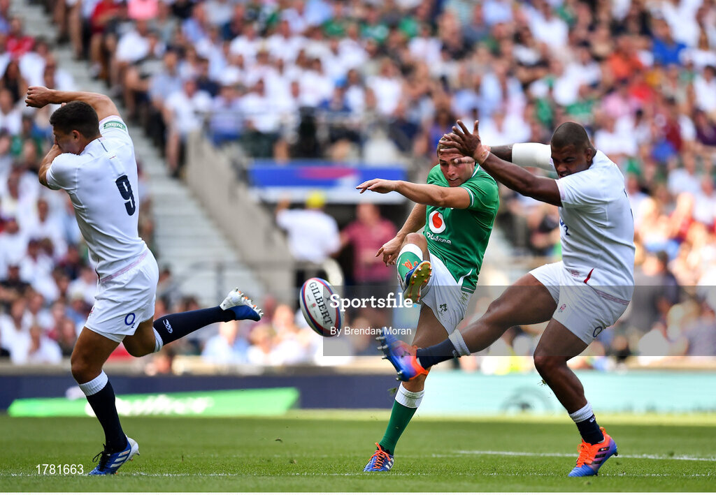 24 August 2019; Jordan Larmour of Ireland kicks between Ben Youngs, left, and Kyle Sinckler of England during the Quilter International match between England and Ireland at Twickenham Stadium in London, England. Photo by Brendan Moran/Sportsfile