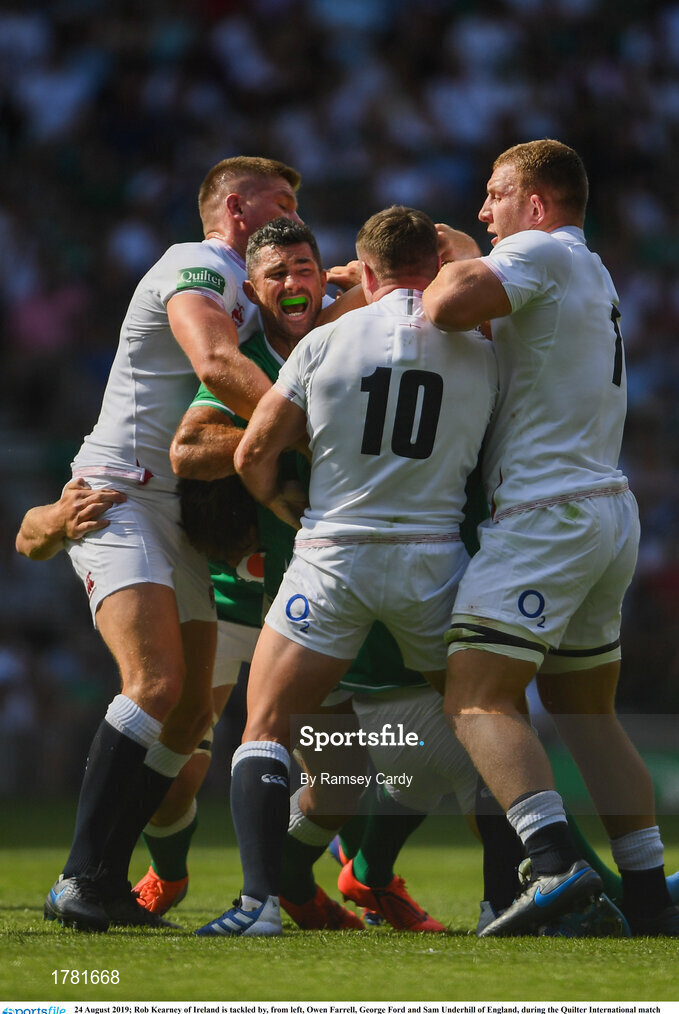 24 August 2019; Rob Kearney of Ireland is tackled by, from left, Owen Farrell, George Ford and Sam Underhill of England, during the Quilter International match between England and Ireland at Twickenham Stadium in London, England. Photo by Ramsey Cardy/Sportsfile