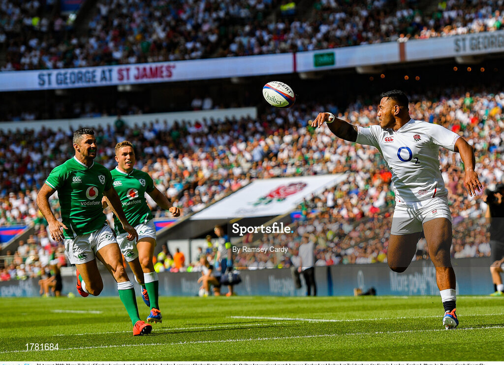 24 August 2019; Manu Tuilagi of Englands missed catch, which led to Jordan Larmour of Ireland's try, during the Quilter International match between England and Ireland at Twickenham Stadium in London, England. Photo by Ramsey Cardy/Sportsfile