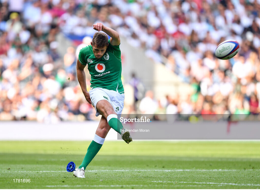 24 August 2019; Ross Byrne of Ireland kicks a penalty during the Quilter International match between England and Ireland at Twickenham Stadium in London, England. Photo by Brendan Moran/Sportsfile