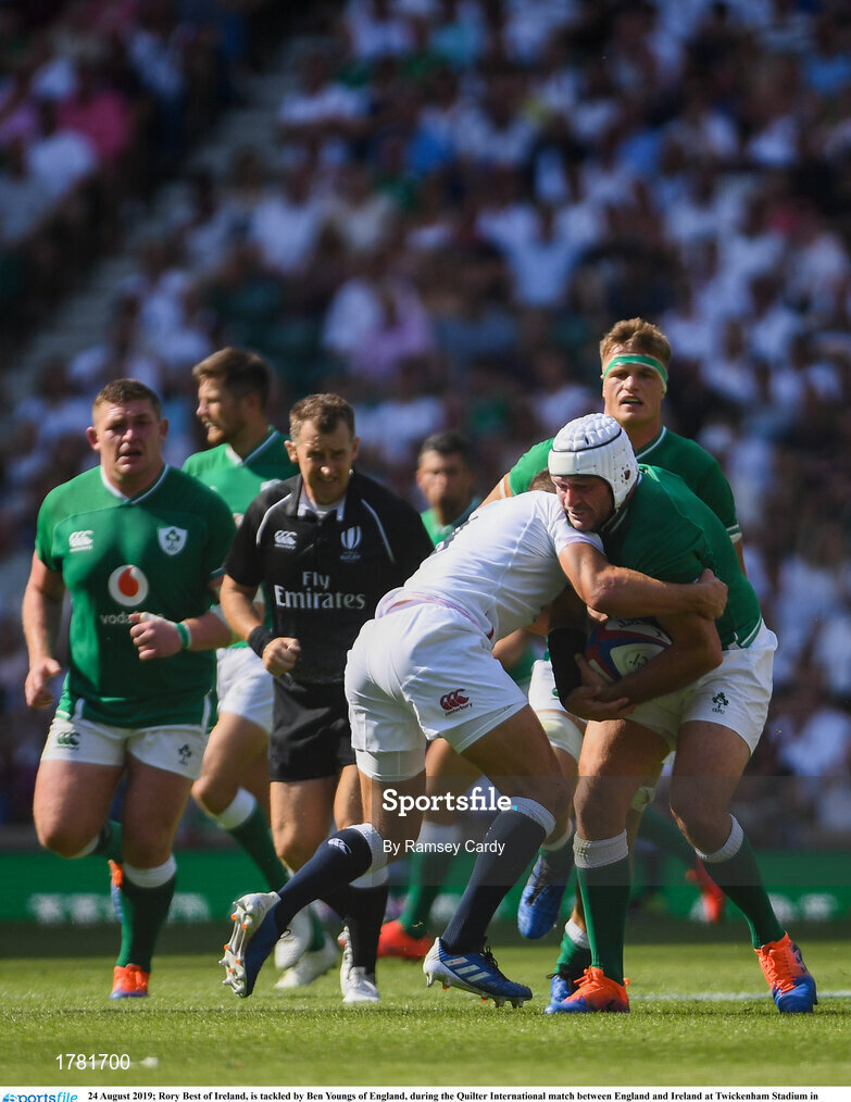 24 August 2019; Rory Best of Ireland, is tackled by Ben Youngs of England, during the Quilter International match between England and Ireland at Twickenham Stadium in London, England. Photo by Ramsey Cardy/Sportsfile