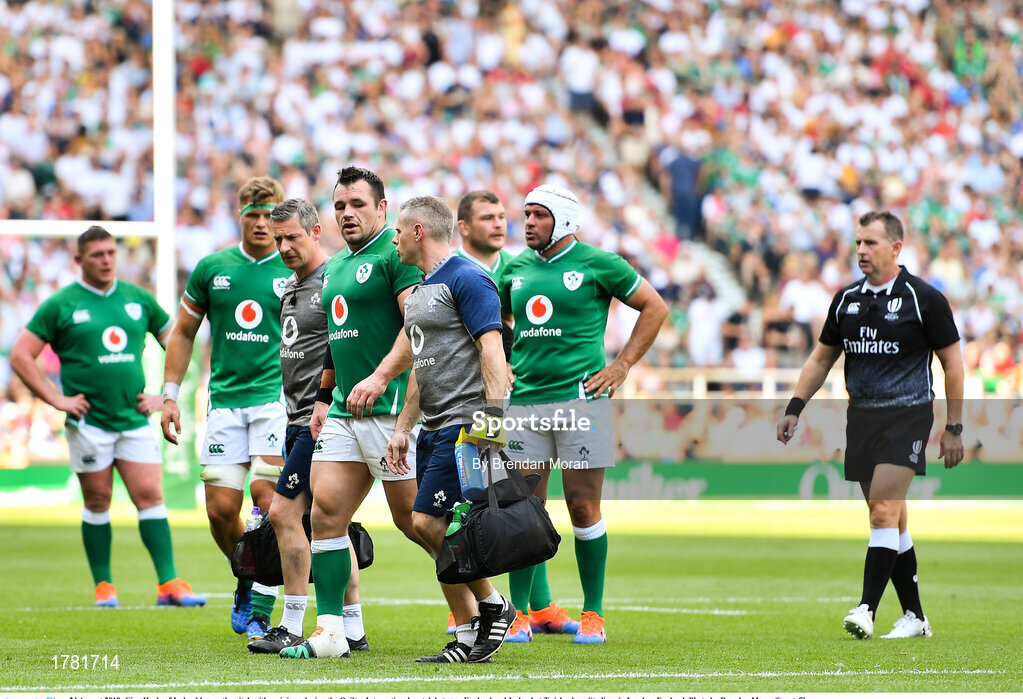 24 August 2019; Cian Healy of Ireland leaves the pitch with an injury during the Quilter International match between England and Ireland at Twickenham Stadium in London, England. Photo by Brendan Moran/Sportsfile