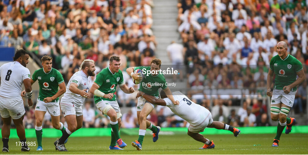 24 August 2019; Jack Carty of Ireland is tackled by Kyle Sinckler of England during the Quilter International match between England and Ireland at Twickenham Stadium in London, England. Photo by Ramsey Cardy/Sportsfile