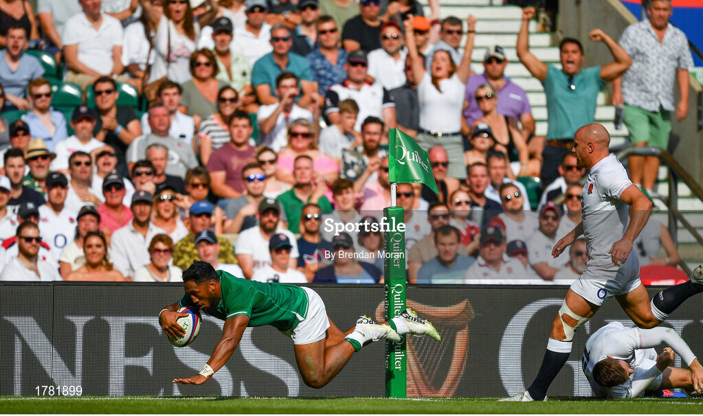 24 August 2019; Bundee Aki of Ireland scores his side's second try during the Quilter International match between England and Ireland at Twickenham Stadium in London, England. Photo by Brendan Moran/Sportsfile