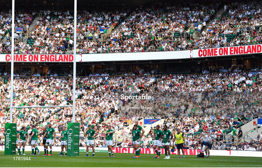 24 August 2019; The Ireland team look on as England convert another try during the Quilter International match between England and Ireland at Twickenham Stadium in London, England. Photo by Brendan Moran/Sportsfile