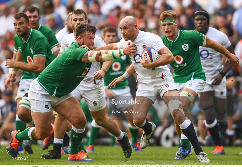 24 August 2019; Willi Heinz of England is tackled by Andrew Porter of Ireland during the Quilter International match between England and Ireland at Twickenham Stadium in London, England. Photo by Ramsey Cardy/Sportsfile