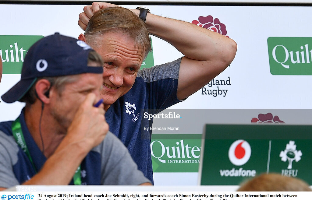 24 August 2019; Ireland head coach Joe Schmidt, right, and forwards coach Simon Easterby during the Quilter International match between England and Ireland at Twickenham Stadium in London, England. Photo by Brendan Moran/Sportsfile