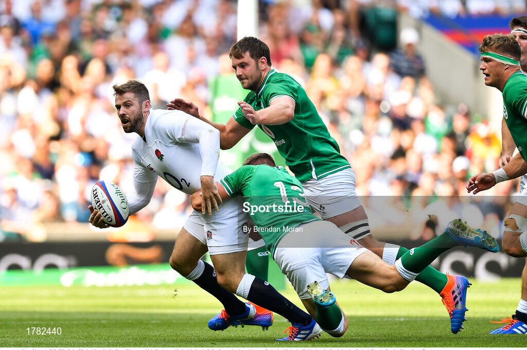 24 August 2019; Elliot Daly of England is tackled by Garry Ringrose and Iain Henderson of Ireland during the Quilter International match between England and Ireland at Twickenham Stadium in London, England. Photo by Brendan Moran/Sportsfile