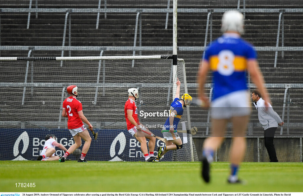 24 August 2019; Andrew Ormond of Tipperary celebrates after scoring a goal during the Bord Gáis Energy GAA Hurling All-Ireland U20 Championship Final match between Cork and Tipperary at LIT Gaelic Grounds in Limerick. Photo by David Fitzgerald/Sportsfile