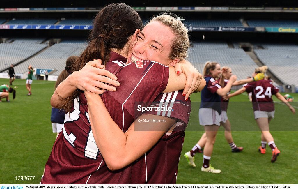 25 August 2019; Megan Glynn of Galway, right celebrates with Fabienne Cooney following the TG4 All-Ireland Ladies Senior Football Championship Semi-Final match between Galway and Mayo at Croke Park in Dublin. Photo by Sam Barnes/Sportsfile