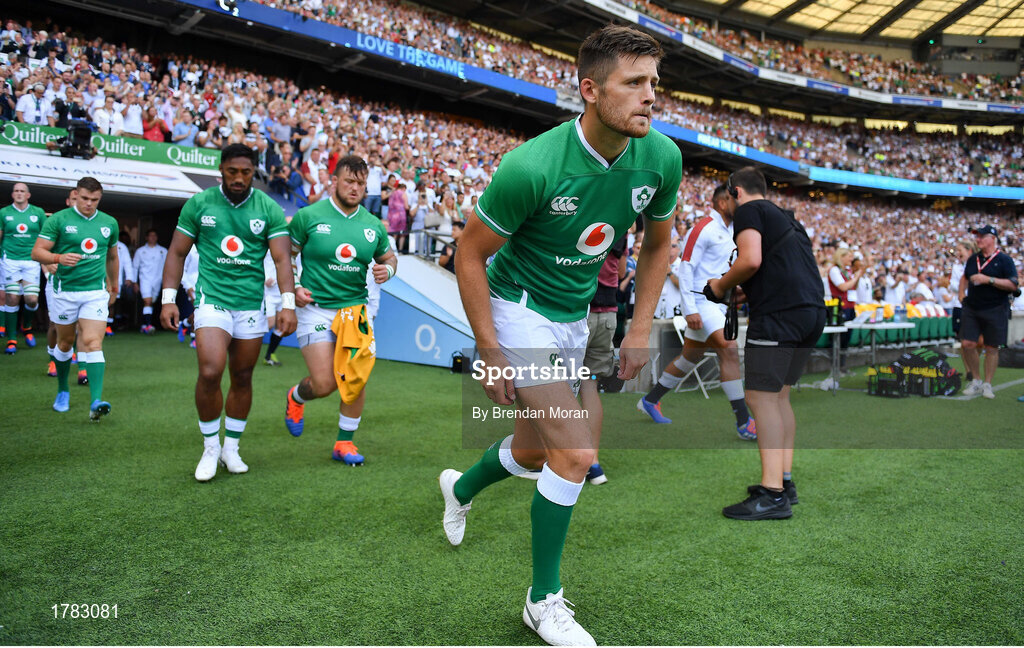 24 August 2019; Ross Byrne of Ireland runs out prior to the Quilter International match between England and Ireland at Twickenham Stadium in London, England. Photo by Brendan Moran/Sportsfile