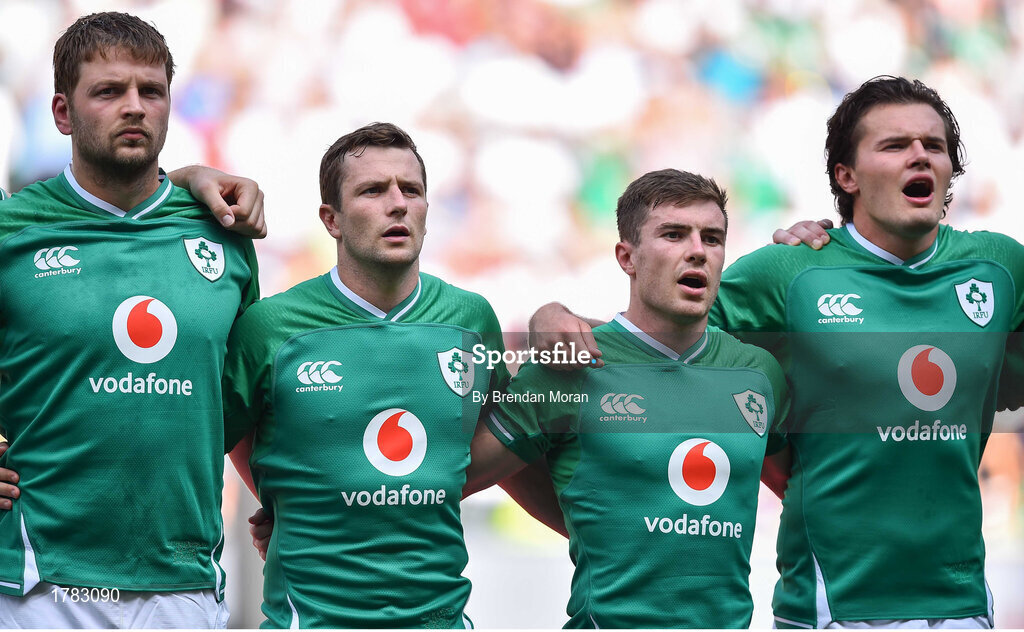 24 August 2019; Ireland players, from left, Iain Henderson, Jack Carty, Luke McGrath and Jacob Stockdale prior to the Quilter International match between England and Ireland at Twickenham Stadium in London, England. Photo by Brendan Moran/Sportsfile