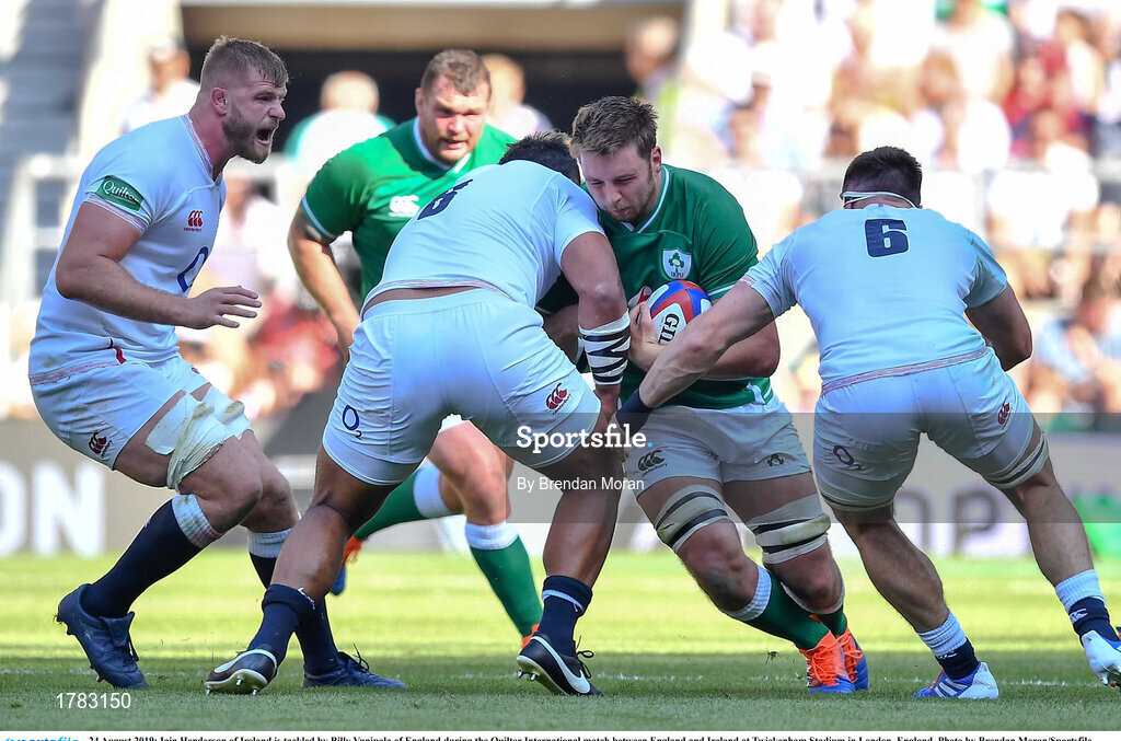 24 August 2019; Iain Henderson of Ireland is tackled by Billy Vunipola of England during the Quilter International match between England and Ireland at Twickenham Stadium in London, England. Photo by Brendan Moran/Sportsfile