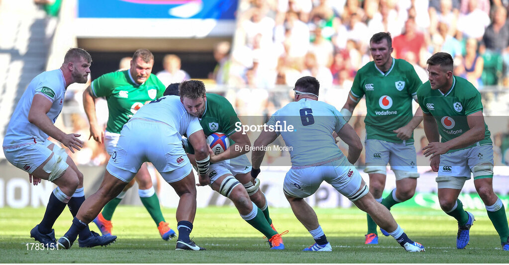 24 August 2019; Iain Henderson of Ireland is tackled by Billy Vunipola of England during the Quilter International match between England and Ireland at Twickenham Stadium in London, England. Photo by Brendan Moran/Sportsfile