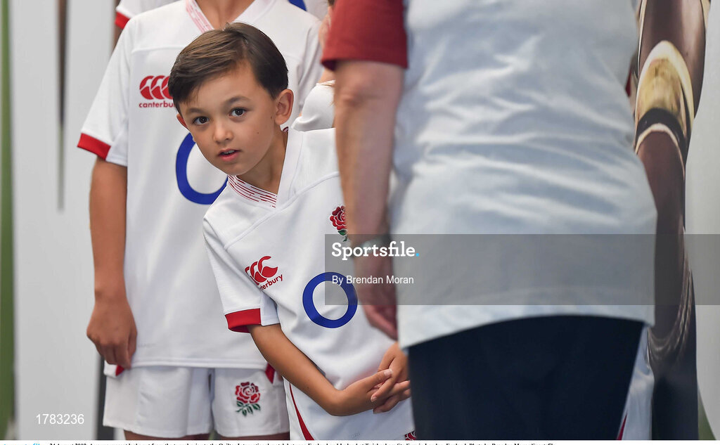 24 August 2019; A young mascot looks out from the tunnel prior to the Quilter International match between England and Ireland at Twickenham Stadium in London, England. Photo by Brendan Moran/Sportsfile