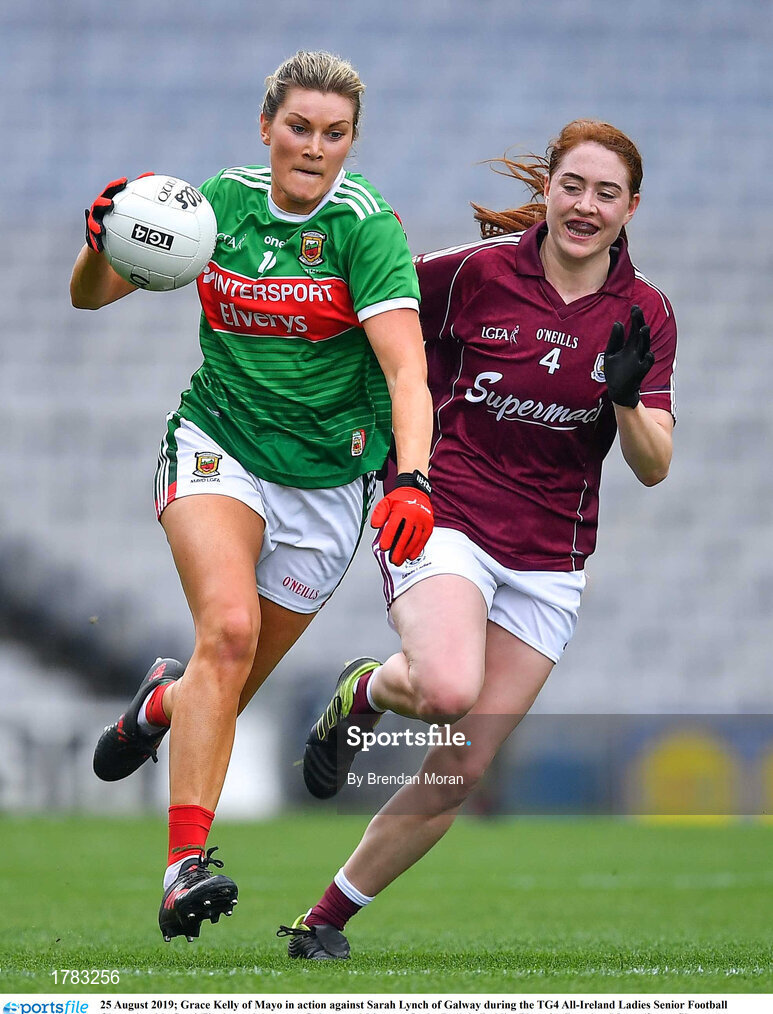 25 August 2019; Grace Kelly of Mayo in action against Sarah Lynch of Galway during the TG4 All-Ireland Ladies Senior Football Championship Semi-Final match between Galway and Mayo at Croke Park in Dublin. Photo by Brendan Moran/Sportsfile