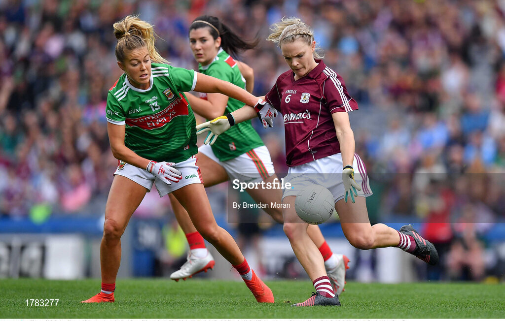 25 August 2019; Barbara Hannon of Galway in action against Sarah Rowe of Mayo during the TG4 All-Ireland Ladies Senior Football Championship Semi-Final match between Galway and Mayo at Croke Park in Dublin. Photo by Brendan Moran/Sportsfile