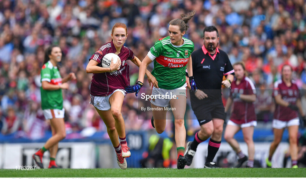 25 August 2019; Olivia Divilly of Galway in action against Clodagh McManamon of Mayo during the TG4 All-Ireland Ladies Senior Football Championship Semi-Final match between Galway and Mayo at Croke Park in Dublin. Photo by Brendan Moran/Sportsfile