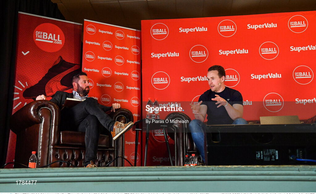 28 August 2019; SuperValu, Ireland’s largest grocery retailer with over 220 stores nationwide, teamed up with Ireland’s leading sports broadcasters, Off The Ball, to bring their award-winning show on the road throughout the summer, to celebrate SuperValu’s 10th year as sponsor of the GAA Football All-Ireland Senior Championship. Joined by a host of special guests, the final stop on the SuperValu Off The Ball roadshow was St Vincent’s GAA Club in Clontarf, which took place on Wednesday 26th August. Pictured at the event are Nathan Murphy of Off The Ball, left, with former Mayo footballer Andy Moran. Photo by Piaras Ó Mídheach/Sportsfile