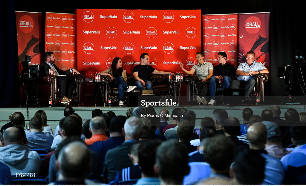 28 August 2019; SuperValu, Ireland’s largest grocery retailer with over 220 stores nationwide, teamed up with Ireland’s leading sports broadcasters, Off The Ball, to bring their award-winning show on the road throughout the summer, to celebrate SuperValu’s 10th year as sponsor of the GAA Football All-Ireland Senior Championship. Joined by a host of special guests, the final stop on the SuperValu Off The Ball roadshow was St Vincent’s GAA Club in Clontarf, which took place on Wednesday 26th August. Pictured at the event are, from left, Nathan Murphy of Off The Ball, former Dublin footballer Denise Masterson, former Mayo footballer Andy Moran, former Dublin footballers Mossy Quinn and Eamon Fennell and former Dublin football manager Paul 'Pillar' Caffrey. Photo by Piaras Ó Mídheach/Sportsfile