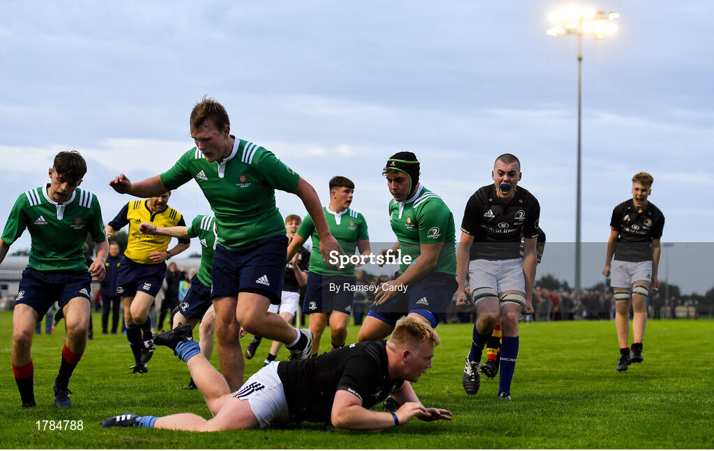 30 August 2019; Evan Gernon, centre, celebrates a try by Metro team-mate Colin Byrne during the Shane Horgan Cup Round 1 match between South East and Metro at Cill Dara RFC in Kildare. Photo by Ramsey Cardy/Sportsfile
