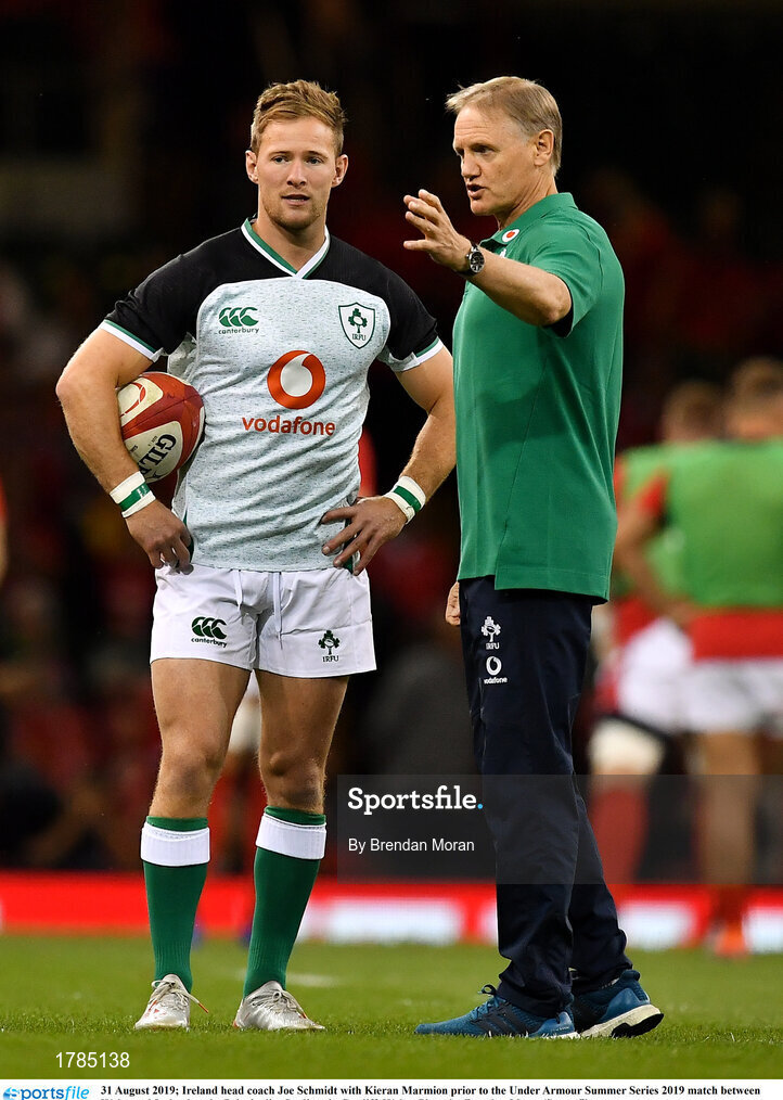 31 August 2019; Ireland head coach Joe Schmidt with Kieran Marmion prior to the Under Armour Summer Series 2019 match between Wales and Ireland at the Principality Stadium in Cardiff, Wales. Photo by Brendan Moran/Sportsfile