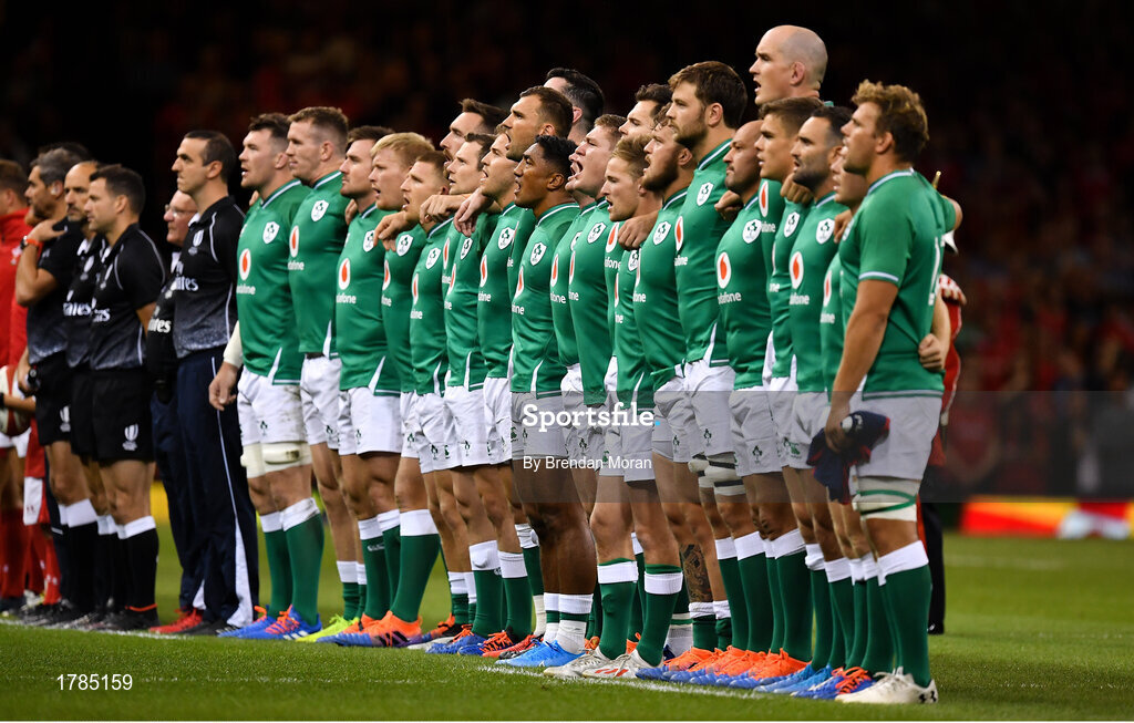 31 August 2019; The Ireland team sing Ireland's Call prior to the Under Armour Summer Series 2019 match between Wales and Ireland at the Principality Stadium in Cardiff, Wales. Photo by Brendan Moran/Sportsfile