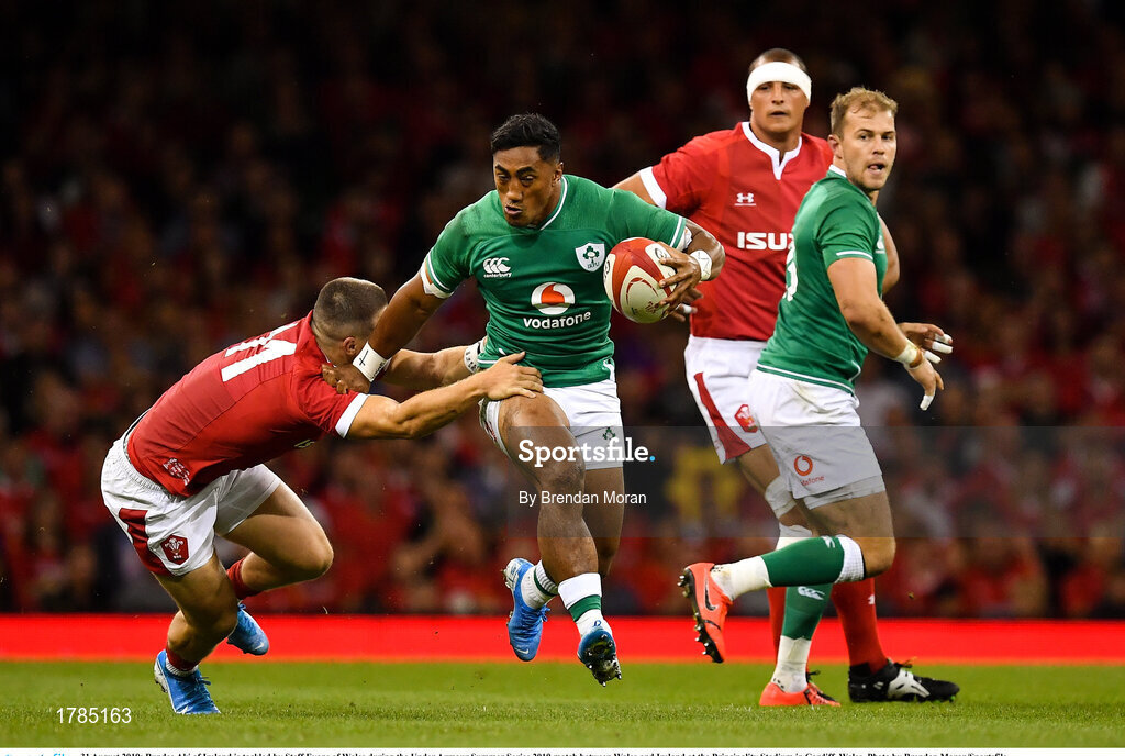 31 August 2019; Bundee Aki of Ireland is tackled by Steff Evans of Wales during the Under Armour Summer Series 2019 match between Wales and Ireland at the Principality Stadium in Cardiff, Wales. Photo by Brendan Moran/Sportsfile