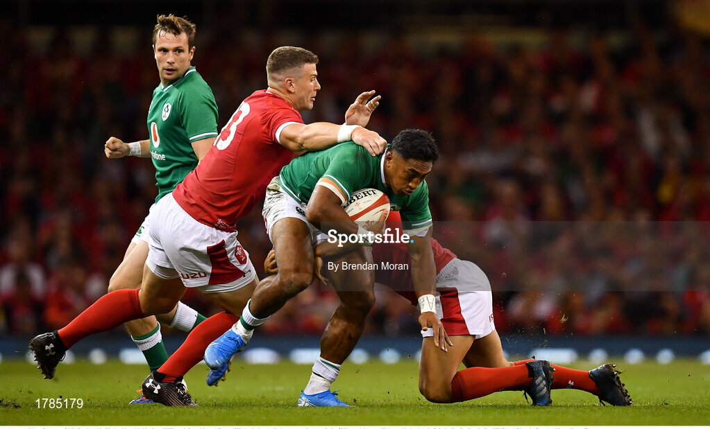 31 August 2019; Bundee Aki of Ireland is tackled by Scott Williams, left, and Jarrod Evans of Wales during the Under Armour Summer Series 2019 match between Wales and Ireland at the Principality Stadium in Cardiff, Wales. Photo by Brendan Moran/Sportsfile
