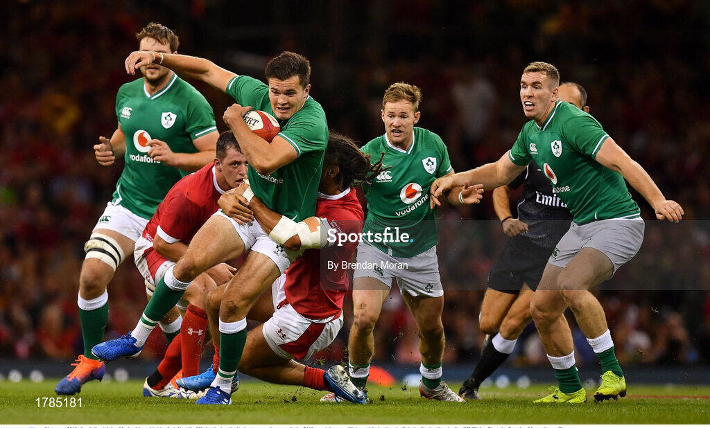 31 August 2019; Jacob Stockdale of Ireland is tackled by Josh Navidi of Wales during the Under Armour Summer Series 2019 match between Wales and Ireland at the Principality Stadium in Cardiff, Wales. Photo by Brendan Moran/Sportsfile
